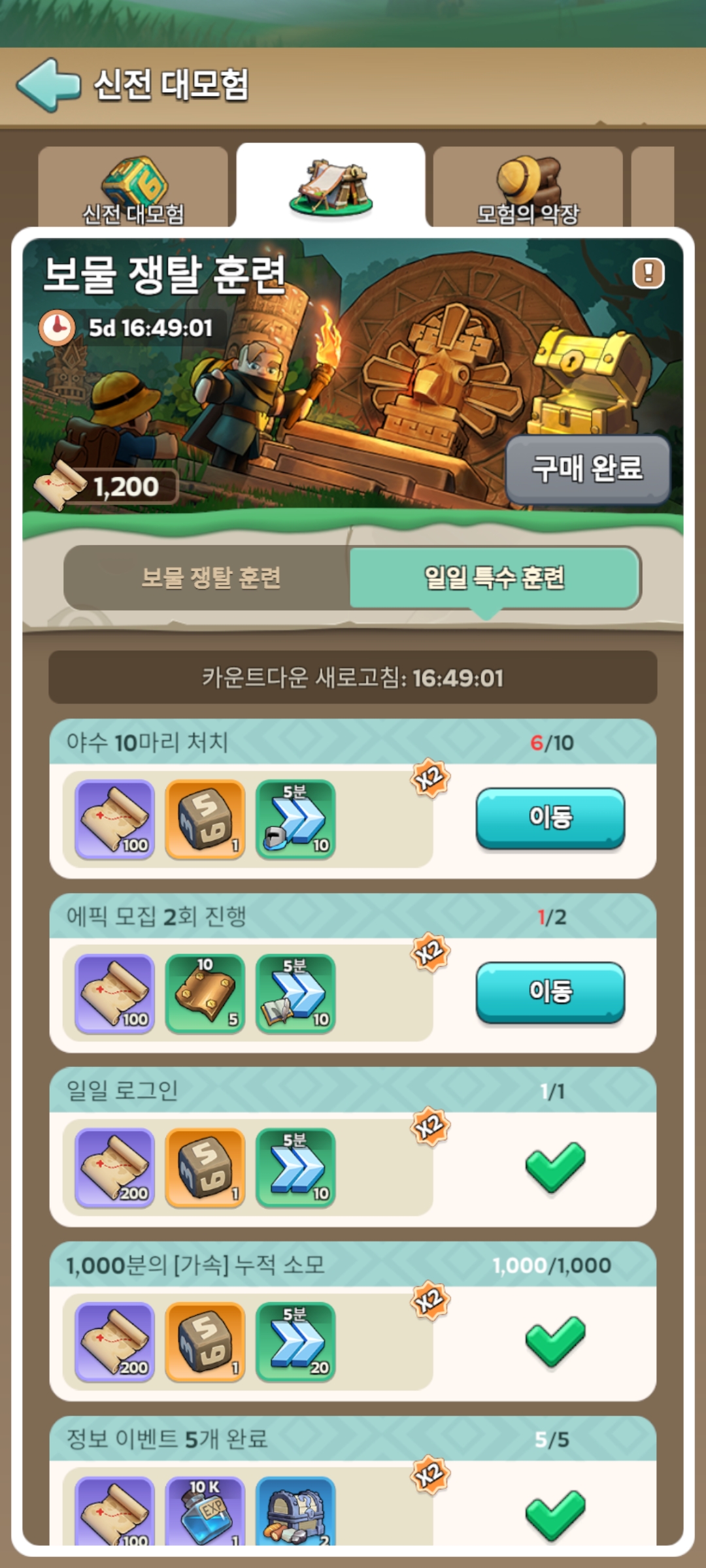 - 효율 측면에서 소과금러는 보물쟁탈 가이드(7,500원)는 구매 추천. 일일보상 2배, 보물쟁탈훈련 추가 보상은 효율이 괜찮음